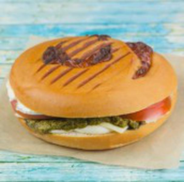 Состав: Тесто, сыр, томат, соус песто, лист салата, майонез.