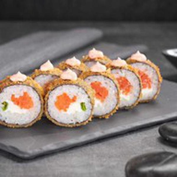 Состав: Лосось, сливочный сыр, яки соус, зеленый лук, темпурный кляр, панировочные сухари, рис, нори
